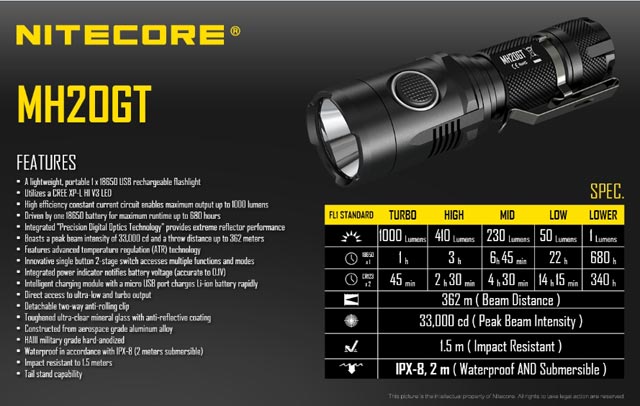 *参考光束実測値:High約1,087Torch lumen :(満充電NITECORE 18650 3,200mAh)