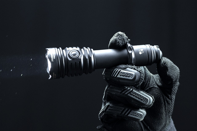 電源のオン/オフ: タクティカルボタンを「カチッ」と音がするまで完全に押し込むとライトが点灯します。