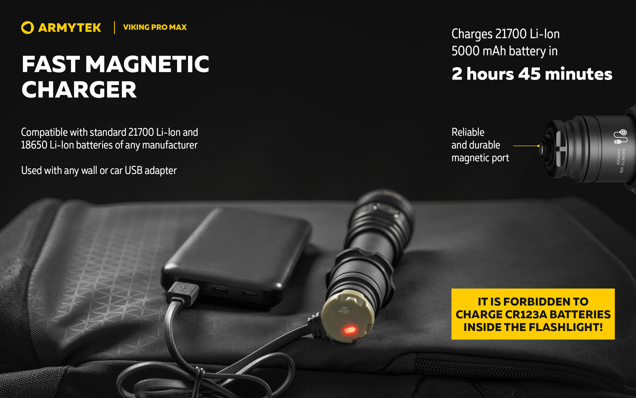 • 【警告】CR123A電池を懐中電灯本体に入れたまま充電することは、絶対におやめください。