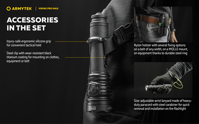 21700 5,000mAhバッテリー、マグネット式USB充電器、クリップ、ランヤード、ナイロンホルスター、シリコン製タクティカルリング(装着済)、スペアOリング2個、取扱説明書