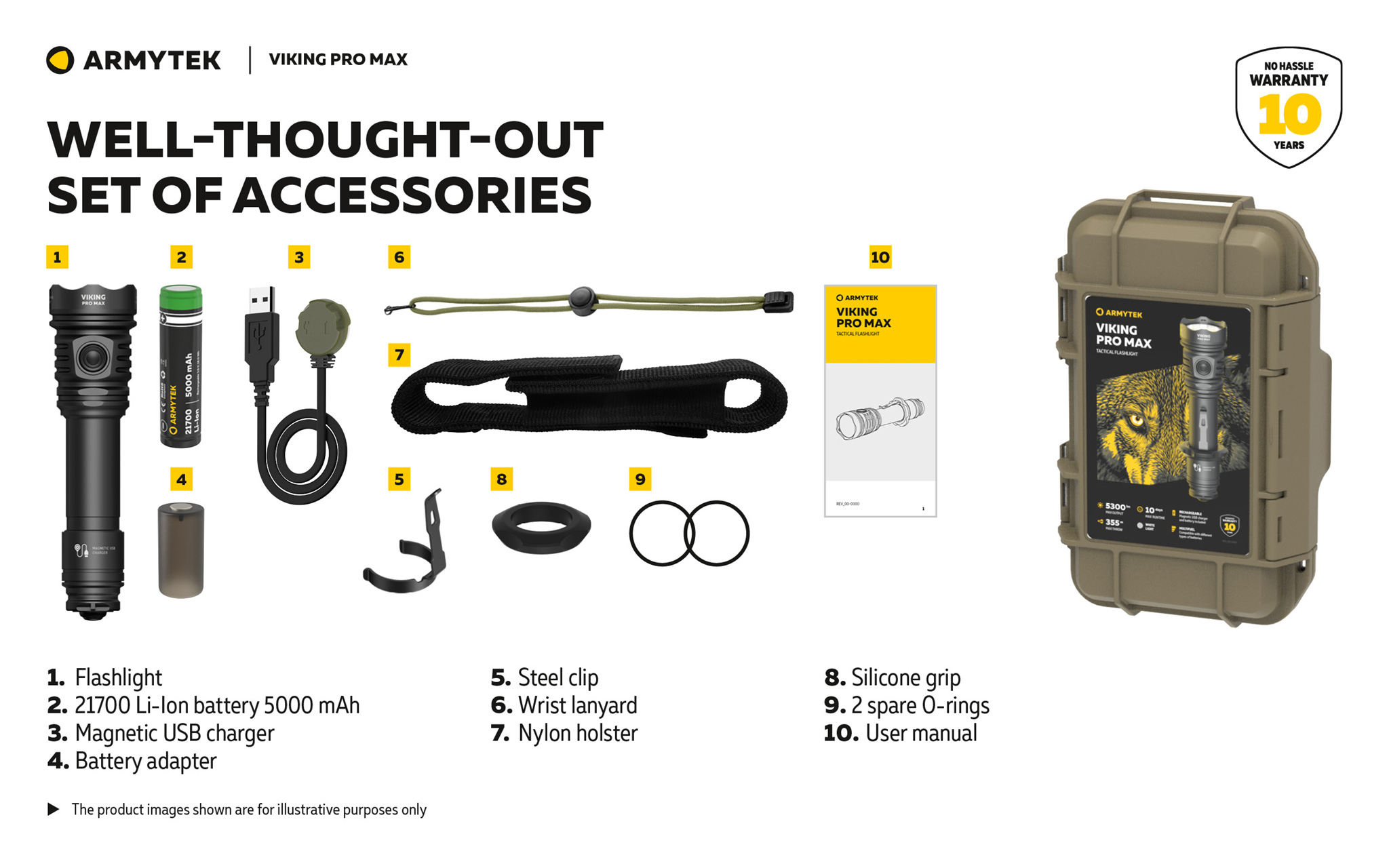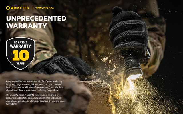 Armytekは、ご購入日から10年間、製品の無料修理を保証します(バッテリー、充電器、スイッチ、コネクターは2年保証)。