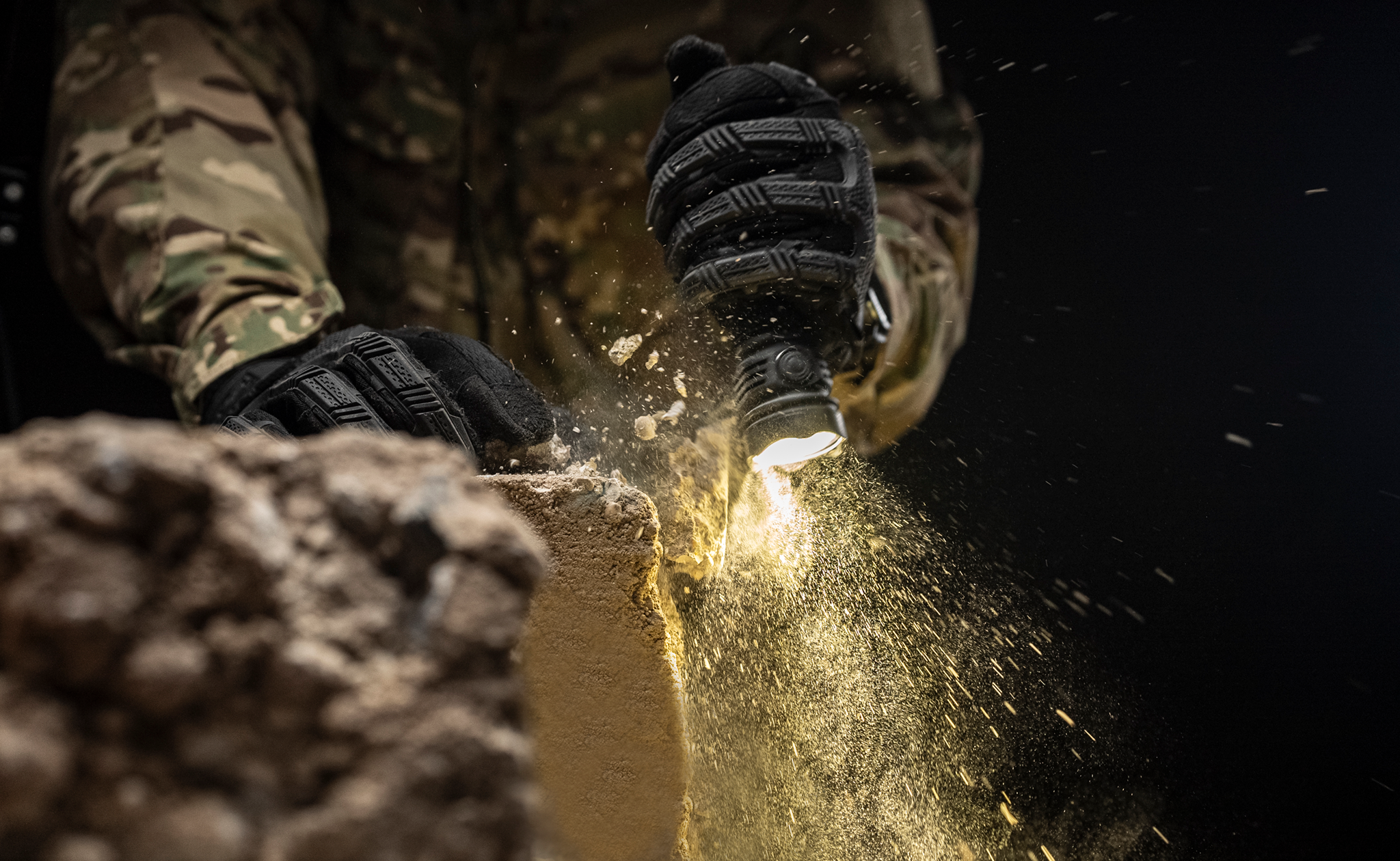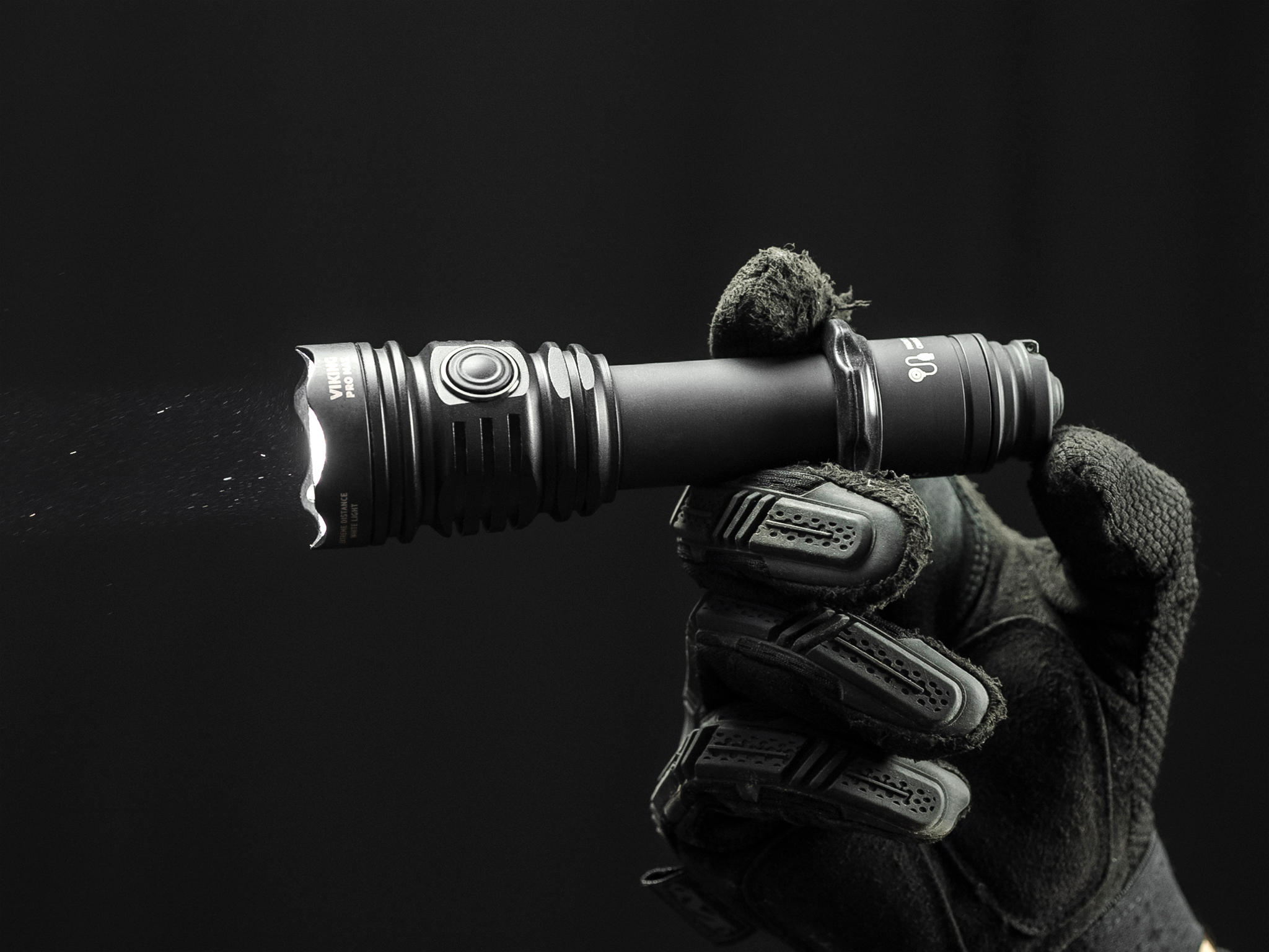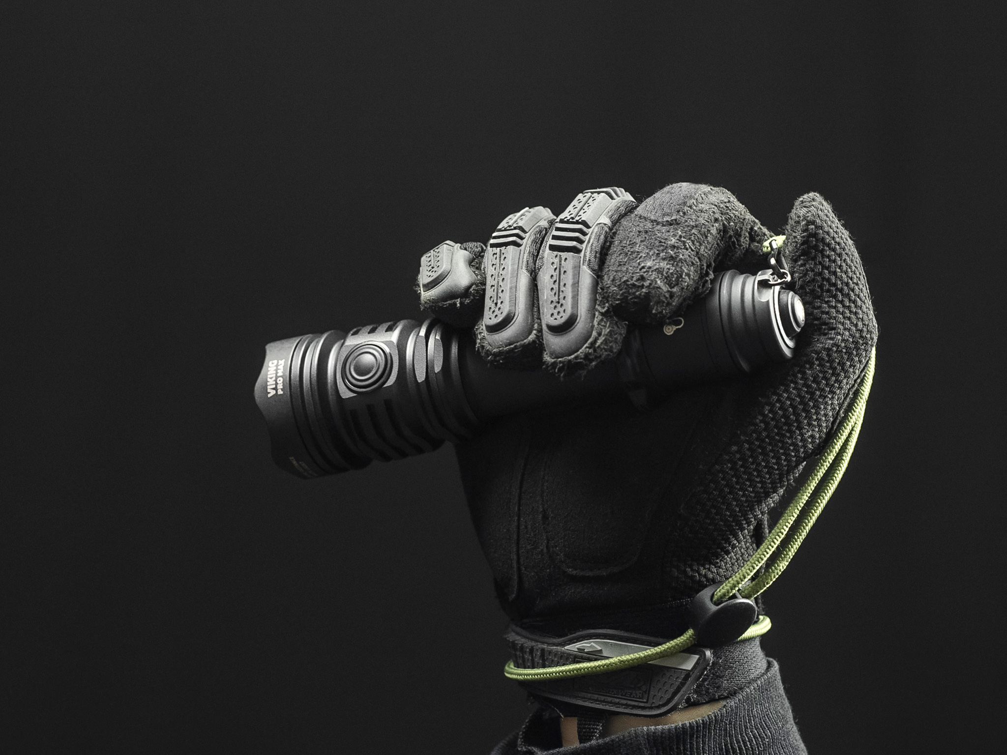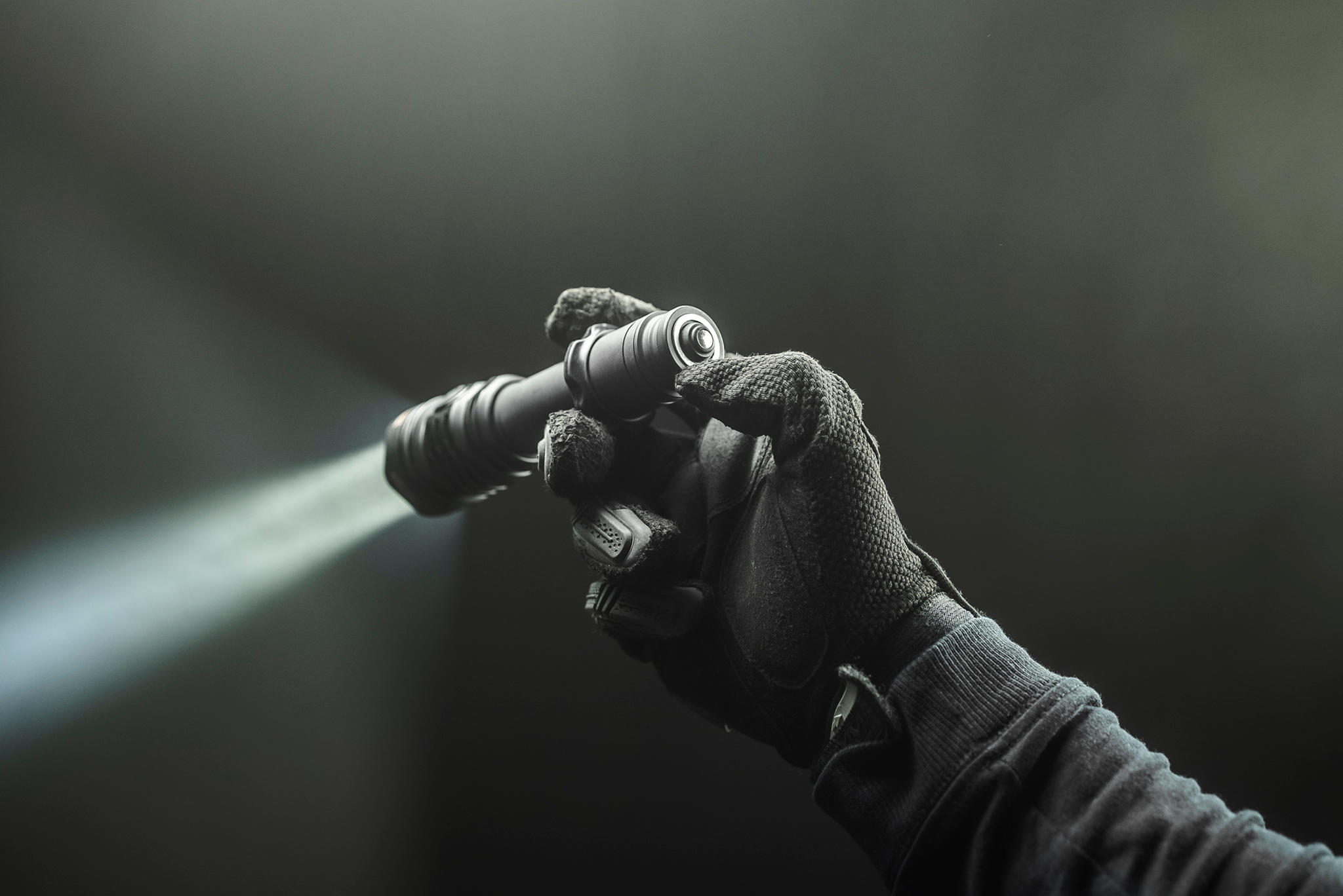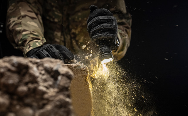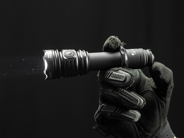 電源のオン/オフ: タクティカルボタンを「カチッ」と音がするまで完全に押し込むとライトが点灯します。