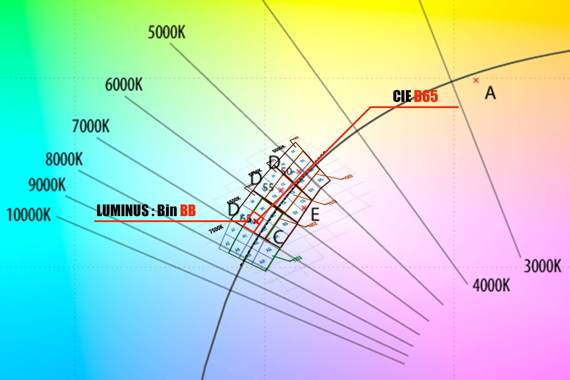 LED光色:6,500K 色 Bin BB CIE 標準光源 D65 を含む Binです