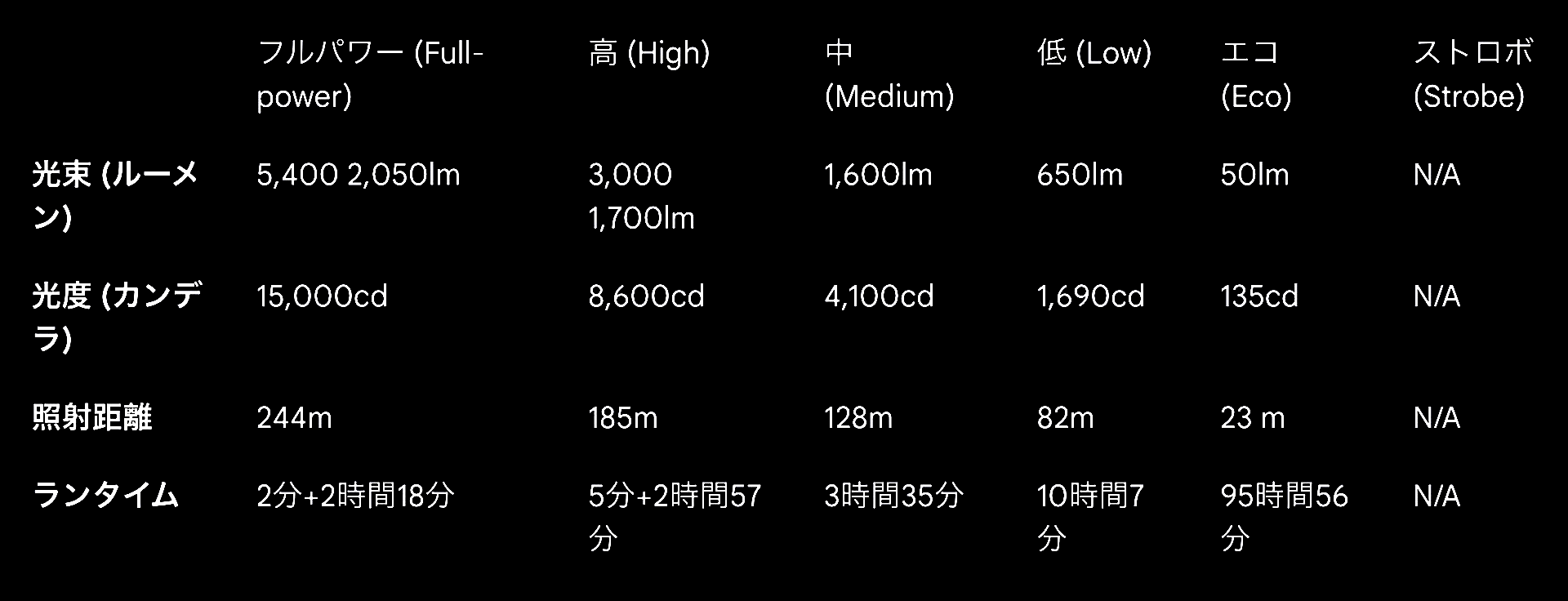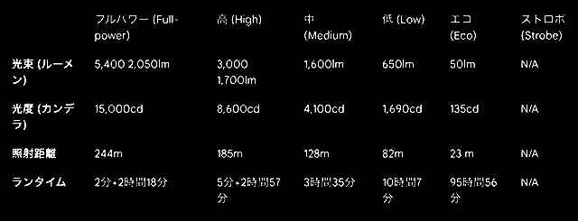 High-Mode, 1,000 lm, 715メートル 2.5時間照度低下無し